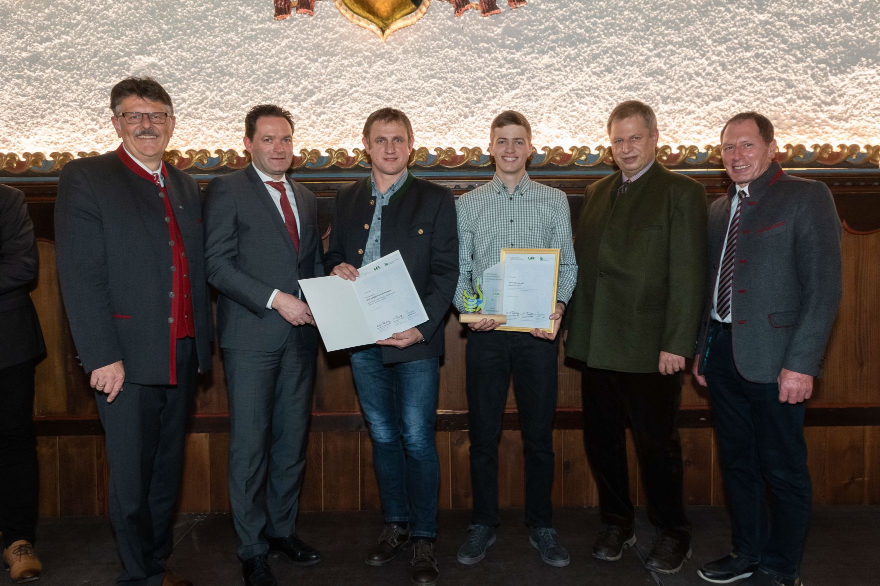 Bundesminister Norbert Totschnig, der Vorsitzende des Landarbeiterkammertags Andreas Freistetter und Landwirtschaftskammerpräsident Josef Moosbrugger zeichneten Lehrlinge und Meister:innen aus, die ihre Facharbeiter- bzw. Meisterprüfung mit Auszeichnung bestanden haben.