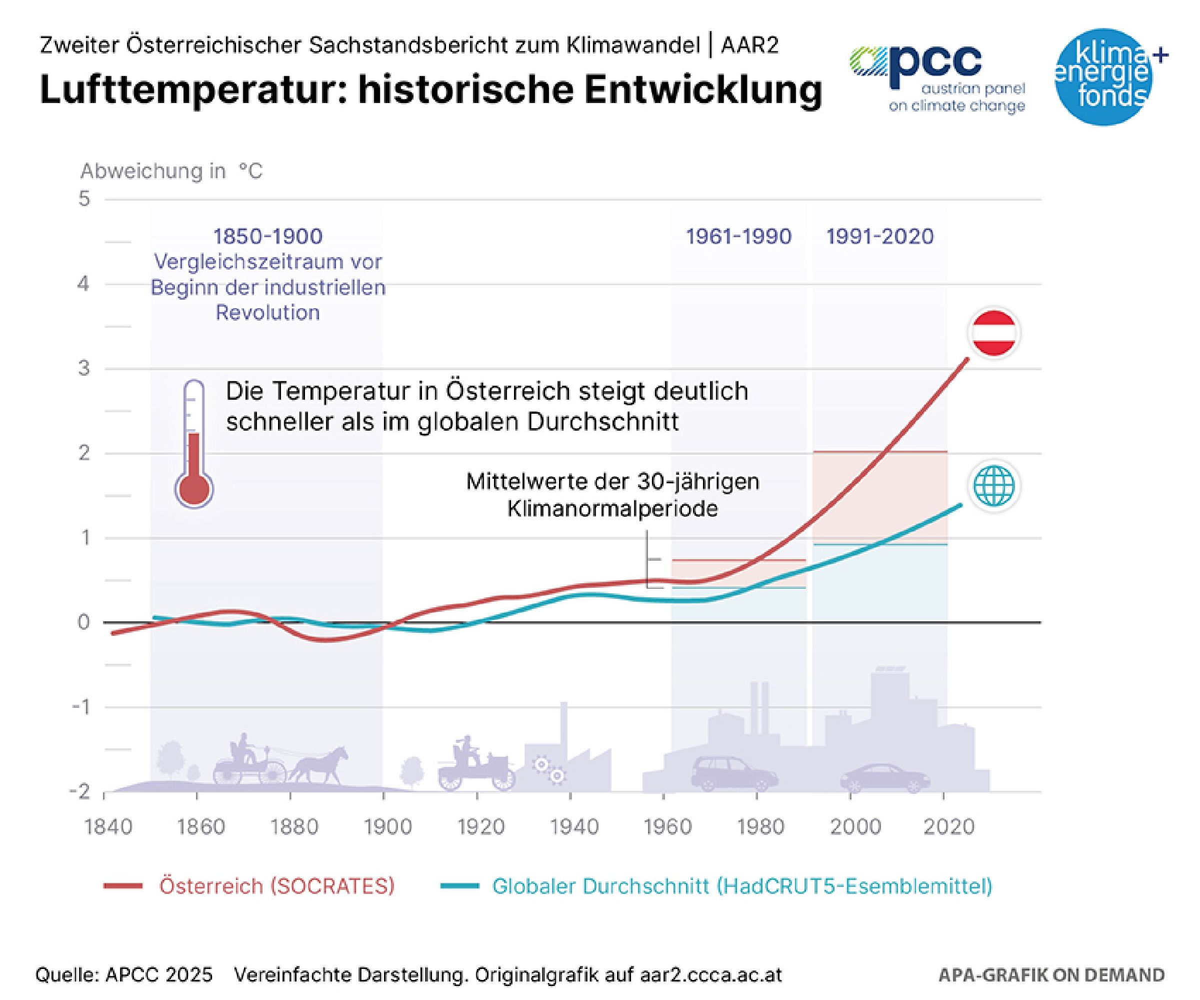 Österreich erwärmt sich mehr als doppelt so schnell wie der globale Durchschnitt. Konkret ist seit 1900 die durchschnittliche Temperatur in Österreich um rund 3,1 Grad Celsius gestiegen. Die Folgen sind bereits deutlich spürbar: Extremwetterereignisse wie Hitzewellen, Dürreperioden, Starkregen und Muren nehmen zu und die Risiken sowie Schäden zeigen sich längst in allen Lebens- und Wirtschaftsbereichen – von Land- und Forstwirtschaft und Gesundheit bis hin zu Infrastruktur, Tourismus und Ökosystemen.