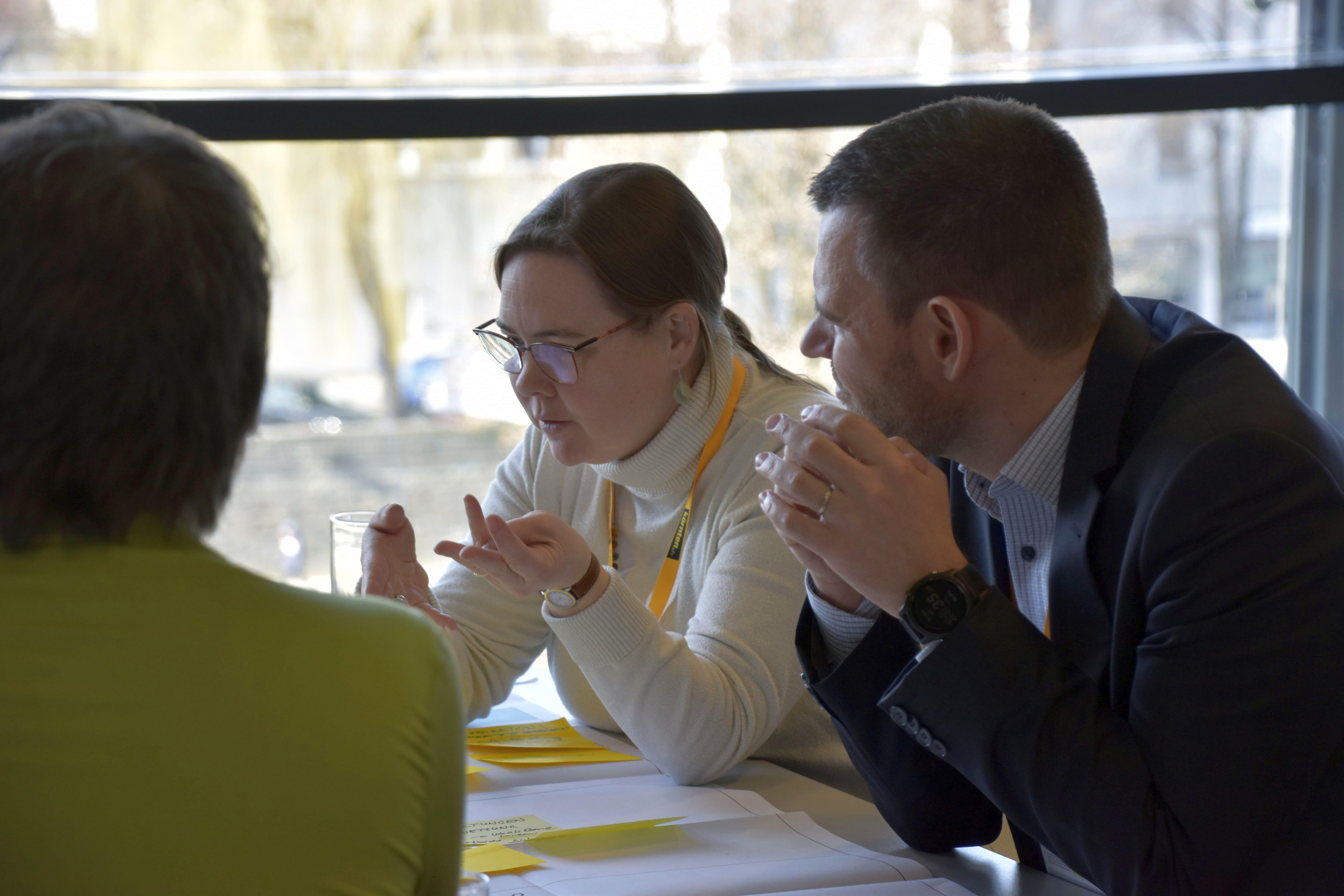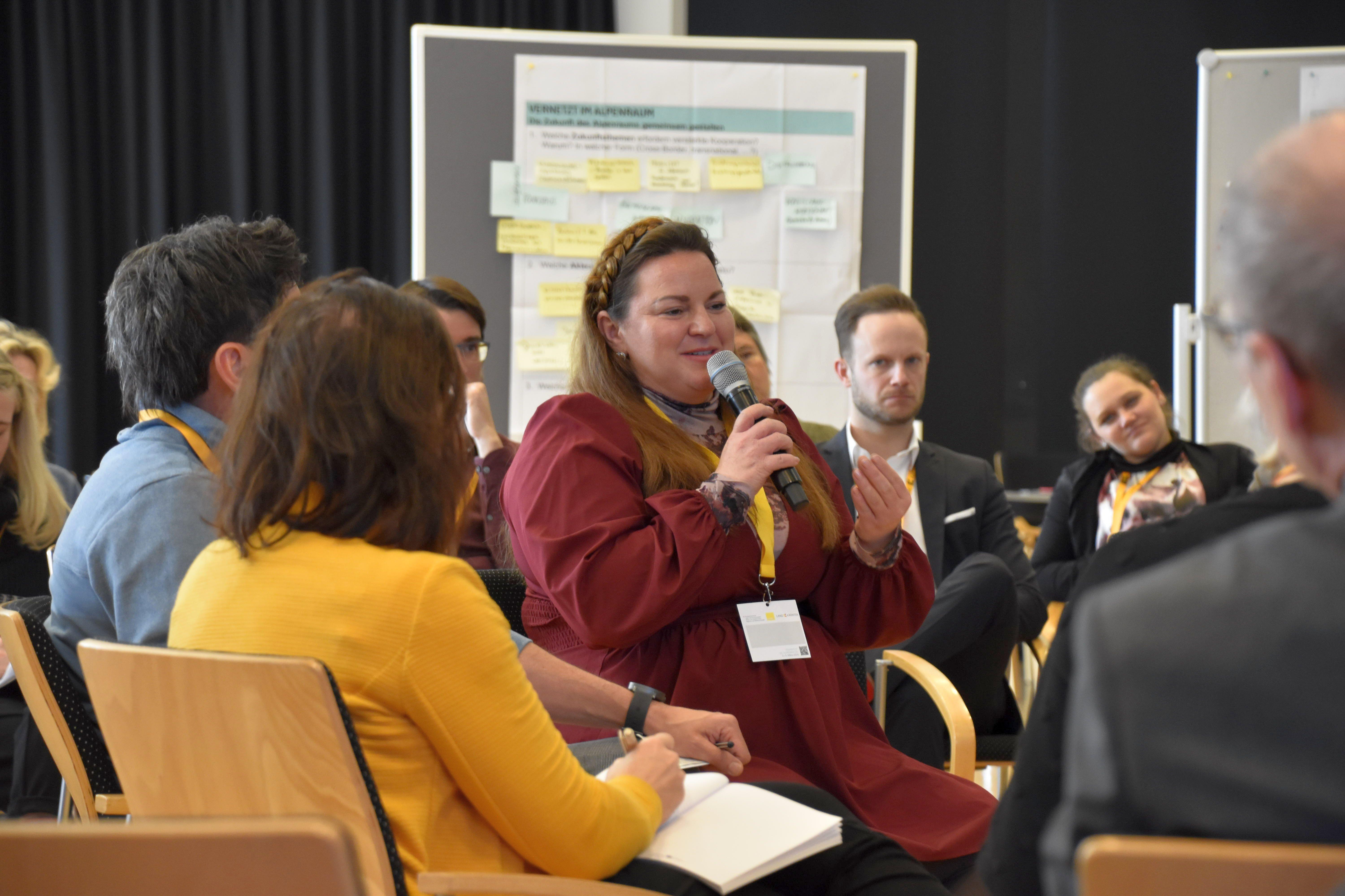 Die "Alpine Mini Talks" dienten als Denkanstöße für einen Austausch in Kleingruppen, bei dem die Teilnehmenden darüber diskutierten, welche Zukunftsthemen verstärkte Kooperation erfordern, welche Akteur:innen und Formate dafür gebraucht werden und welche Wirkungen Programme zukünftig erzielen sollen.