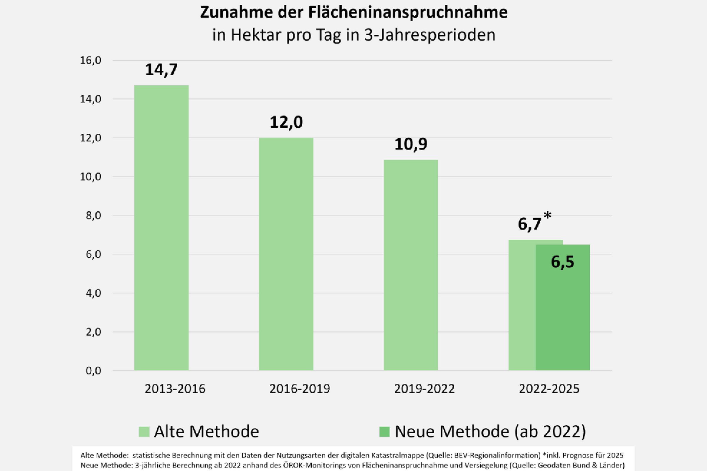- Die durchschnittliche tägliche Flächeninanspruchnahme liegt im Zeitraum 2022-2025 bei 6,5 Hektar pro Tag. Dies ist ein deutlicher Rückgang im Vergleich der Vorperioden.