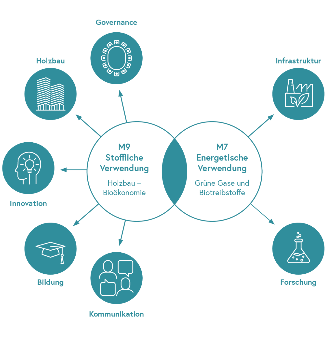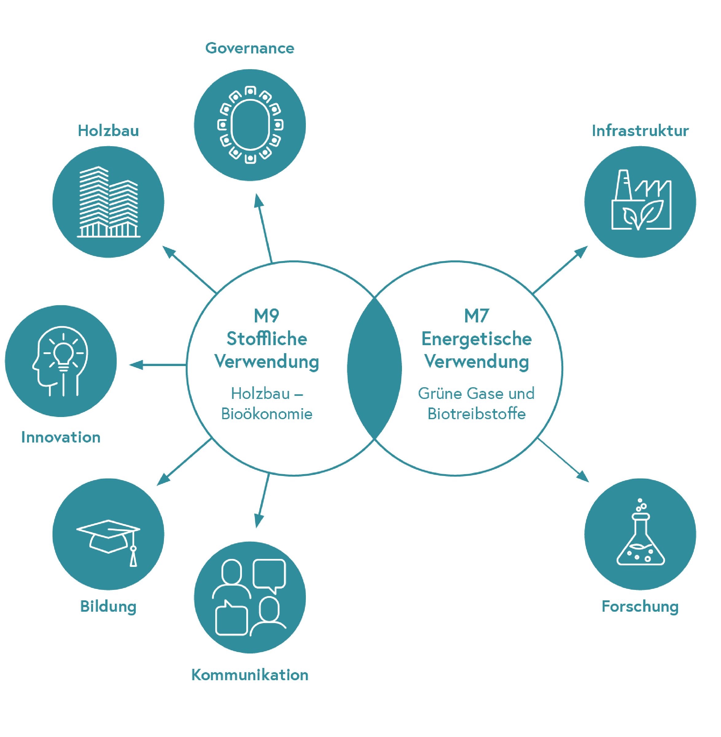 Die Maßnahmen sind nach Themenmodulen gegliedert und reichen von der Politikgestaltung über die stoffliche Verwendung von Holz, Innovation, Aus- und Weiterbildung, Kommunikation bis hin zur Gewinnung von Energie aus Holz.