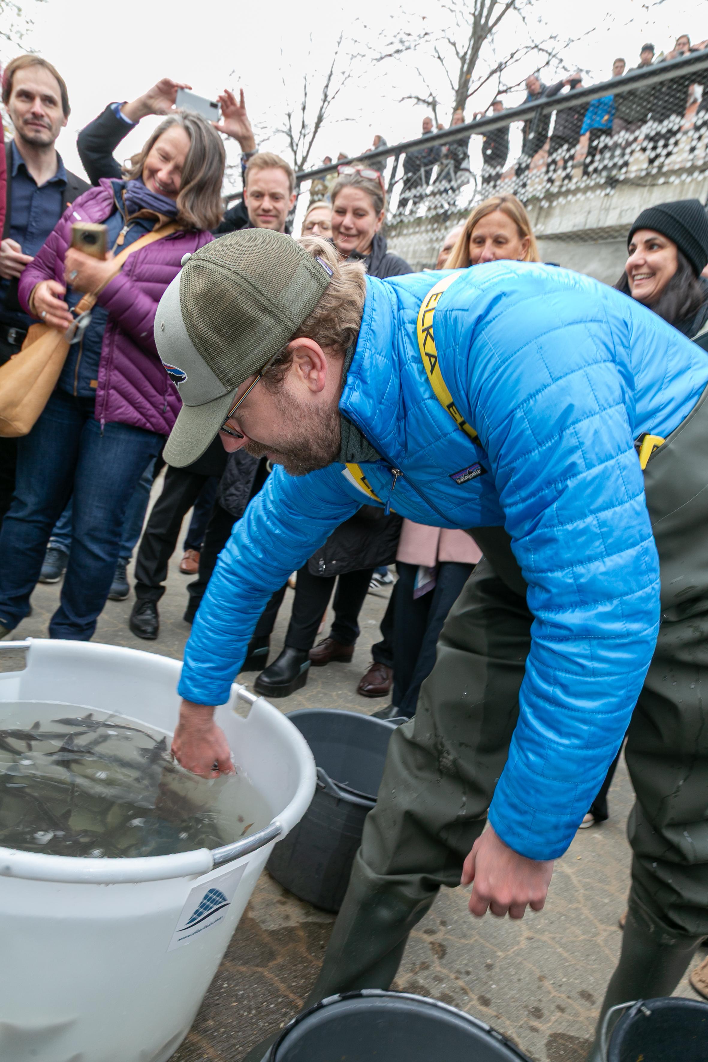 Zum Abschluss der Veranstaltung setzten Wasserminister Totschnig und Minister Novak gemeinsam junge Störe in die Mur ein. Der Besatz steht für die Rückkehr von Artenvielfalt durch Renaturierungsmaßnahmen und für die gemeinsame Verantwortung beider Länder für eine intakte und lebendige Flusslandschaft.