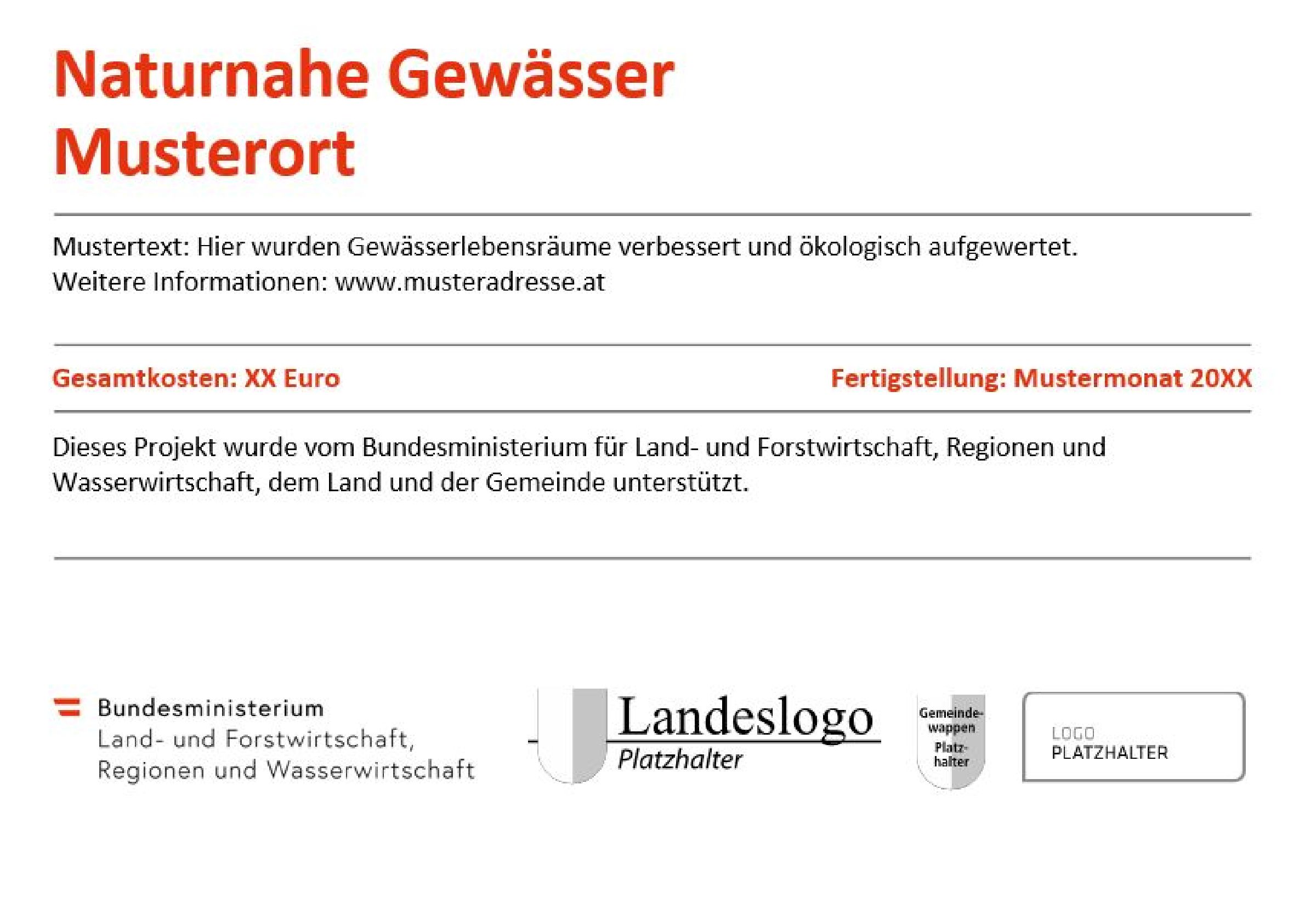 Für Förderungen von Projekten für den Bereich Wasserwirtschaft gibt es Vorlagen für Erinnerungstafeln gemäß Informations- und Publizitätsmaßnahmen.